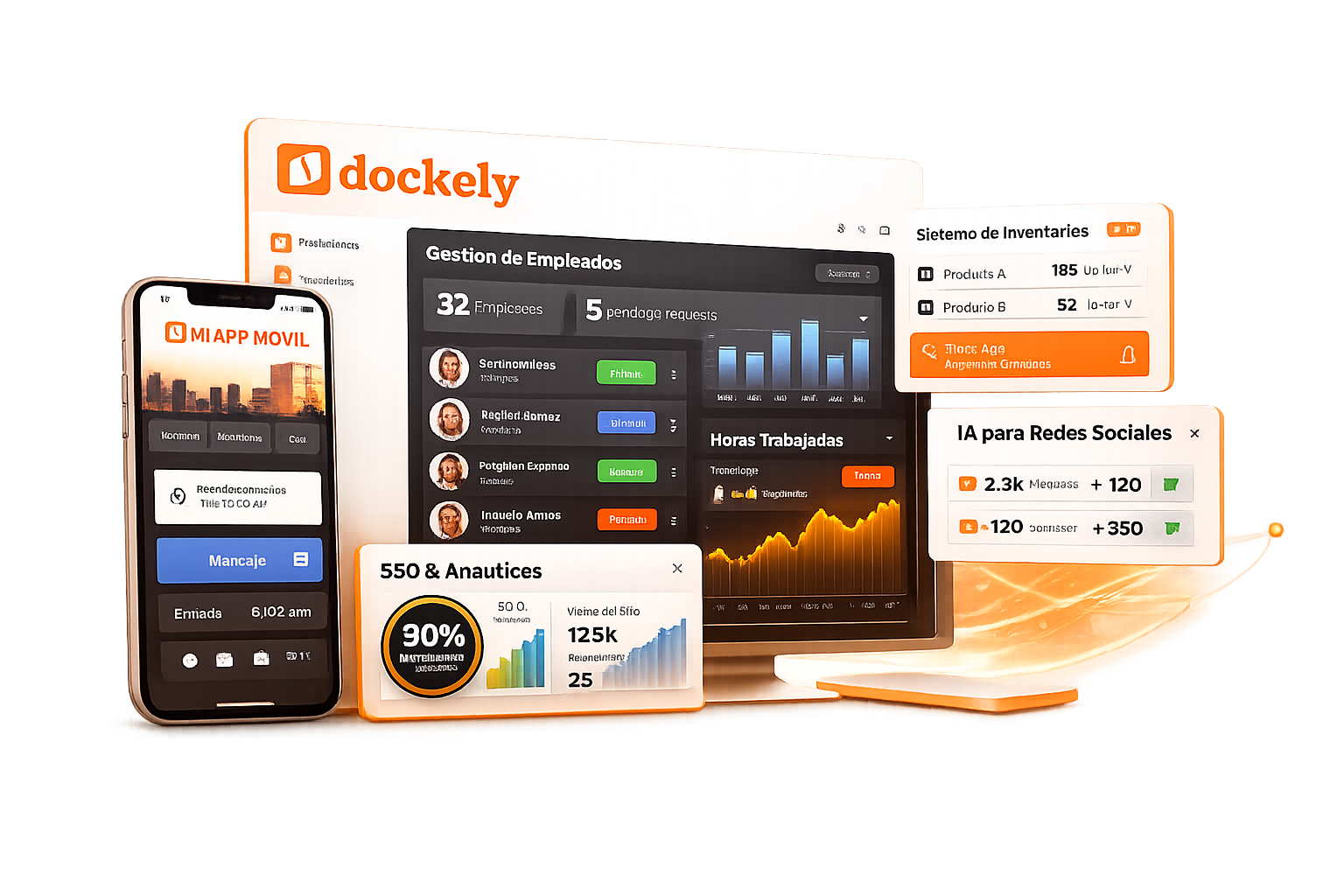La Suite de Dockely es un ecosistema empresarial diseñado para digitalizar tu negocio de forma flexible. Puedes crear tu propia app móvil, gestionar empleados, controlar inventario, optimizar tu SEO y potenciar tus redes sociales con Inteligencia Artificial desde un único panel de control.